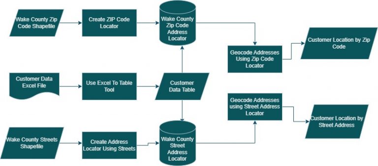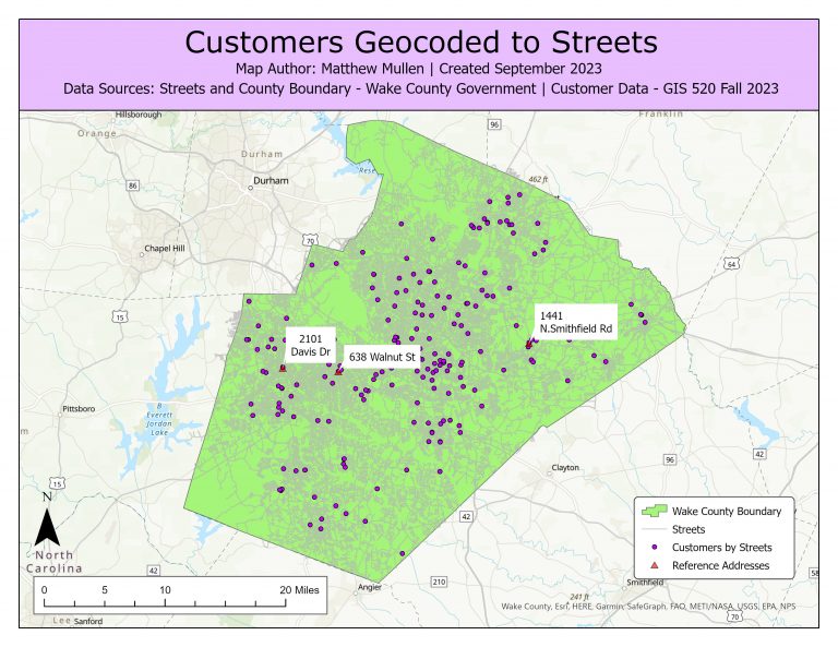 To complete the objectives of this assignment, I used ESRI ArcGIS Pro 2.9.5 and various geocoding tools from the toolboxes included in ArcGIS Pro. The geocoding tools used were the Create Locator tool, Geocode Addresses, and the Rematch Addresses tool. The data used for this process was an Excel spreadsheet with current customer address data provided by the instructor, vector shapefiles of the boundaries of Wake County and the boundaries of zip codes inside Wake County and a shapefile of Wake County streets.