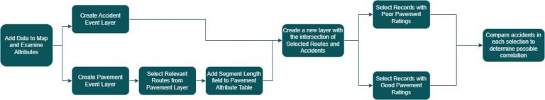 To address this problem, I used ESRI’s ArcGIS Pro 3.1 and customized the ArcGIS interface with the necessary Linear Referencing tools for completing the task. To determine the relationship between pavement conditions and accidents, the tools Make Route Event Layer and Overlay Route Events were used from the Linear Referencing toolbox.